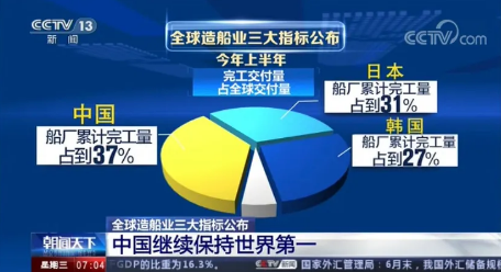全球權威航運造船機構公布的最新數據顯示,今年上半年,全球造船業三大指標,中國再次領先,繼續保持世界第一的紀錄。