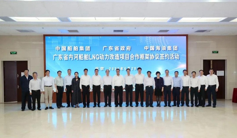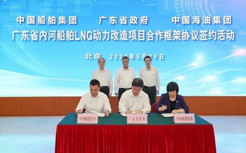 ????5月29日,中國船舶集團有限公司與廣東省人民政府、中國海洋石油有限公司在京簽署《廣東省內(nèi)河船舶LNG動力改造項目合作框架協(xié)議》。廣東省委副書記、省長馬興瑞,中國船舶集團黨組書記、董事長雷凡培,中國海油黨組書記、董事長汪東進,中國船舶集團黨組成員、副總經(jīng)理杜剛,中國海油黨組成員、副總經(jīng)理陳壁出席簽約儀式。廣東省副省長覃偉中,中國船舶集團黨組成員、副總經(jīng)理孫偉,中國海油黨組成員、總會計師溫冬芬分別代表各方在協(xié)議上簽字。