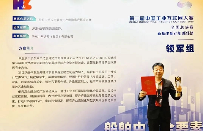 近日,第二屆中國工業互聯網大賽全國總決賽獲獎名單公布。中國船舶集團旗下滬東中華“滬東長興智能制造團隊”的參賽作品《船舶中組立全要素制造執行管理解決方案》,從全國1457個項目中脫穎而出,獲得全國總決賽三等獎。這是中國船舶集團旗下唯一入圍全國總決賽并獲獎的項目。