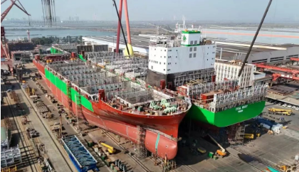 黃埔文沖切實增強自主開發能力,堅持聚焦主建船型,持續推廣自主開發的“鴻鵠”集裝箱船和“海鯨”散貨船系列,成功打造1900TEU集裝箱船、3000TEU集裝箱船、2400TEU甲醇雙燃料集裝箱船和85000噸散貨船等明星船型,形成品牌迭代升級和譜系化;緊抓船舶行業綠色新能源的機遇,黃埔文沖以市場需求為導向,承接了多艘以甲醇、氨燃料等綠色能源為動力的集裝箱船和散貨船訂單。