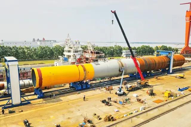 ???日前剛向大家介紹了中國船舶集團旗下黃埔文沖建造的單樁穩樁平臺主體工程順利成型,就在昨天又交付一海上風電產品海上風電單樁。4月14日,黃埔文沖船舶下屬文船重工公司交付了為保利長大工程有限公司建造的首個海上風電單樁。該單樁直徑8.8米,長103.4米,最大板厚85毫米,重1644.3噸,已經達到一艘輕型護衛艦的重量,是目前世界上最大的風電單樁之一。