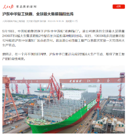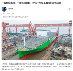 5月19日,中國船舶集團旗下滬東中華雙喜臨門。其建造的全球最大裝箱量24000TEU超大型集裝箱船2號船在長興造船基地順利出塢;建造的13000噸多用途重吊船12號船在浦東廠區命名交付,標志著該項目圓滿收官。這是滬東中華自復工復產以來首次實現一天完成兩大生產節點。