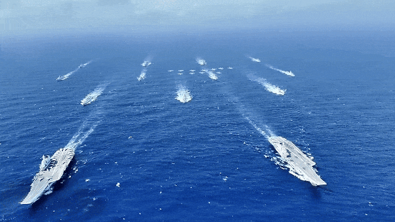 在南海某海域,遼寧艦、山東艦編隊首次開展雙航母編隊演練,錘煉提升航母編隊體系作戰能力